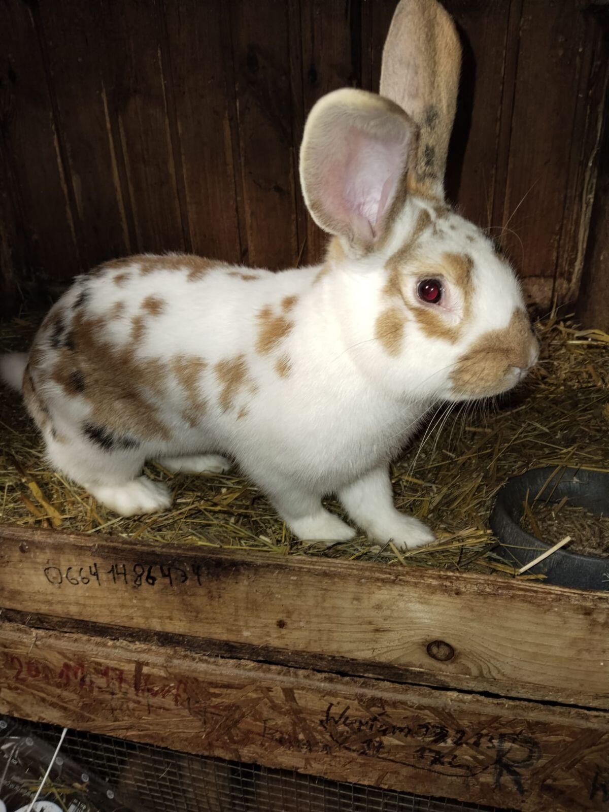 Verkaufe Riesen Scheck Rammler in 4 Farben. Alter 7 Monate. Wird sehr groß. Braver Zuchtrammler. Kaninchen / Hasen Riesenkaninchen