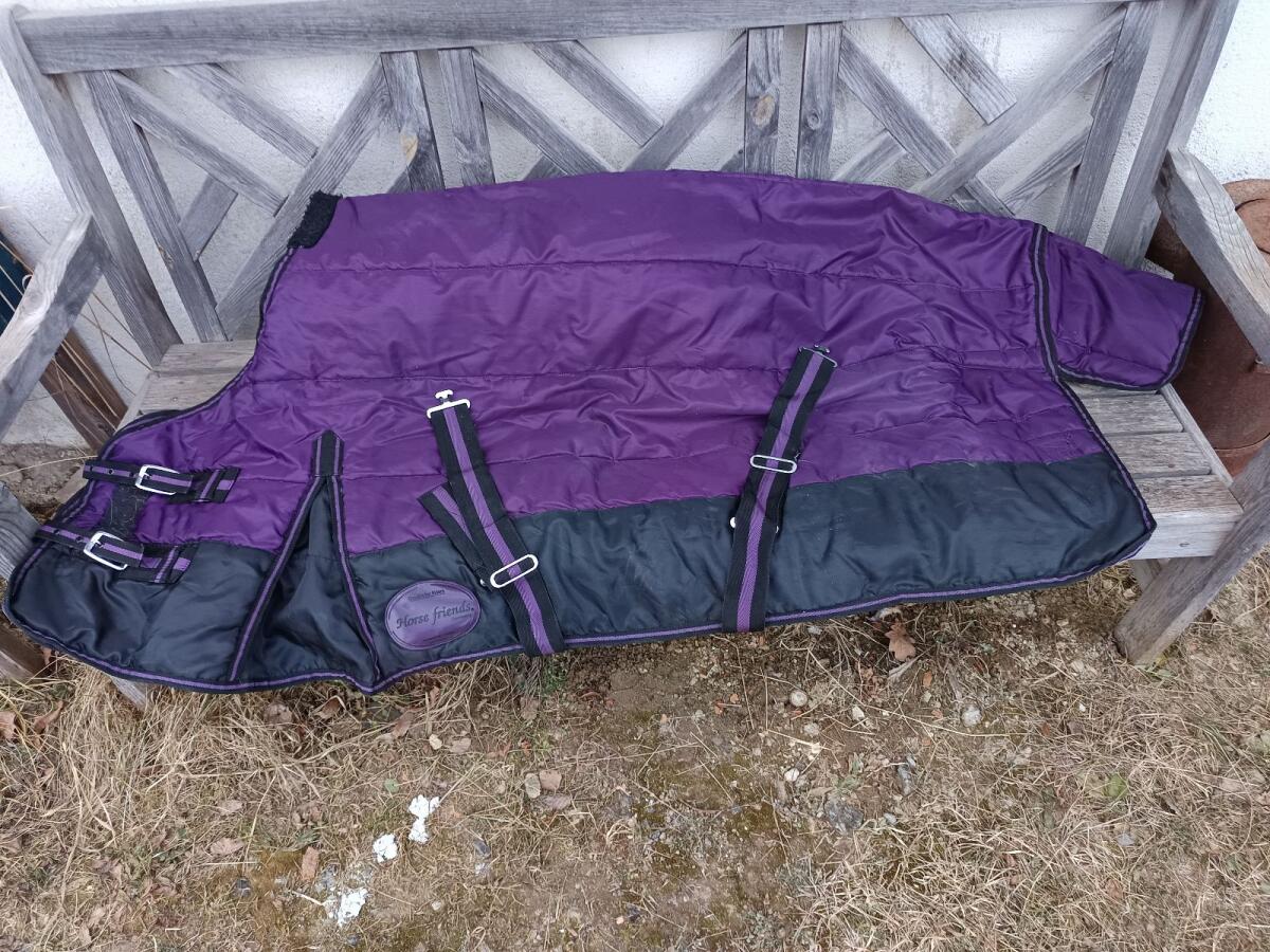 Verkaufe gut erhaltene violett-schwarze, wattierte Winterdecke für Ponys oder Fohlen, 105 cm + Latz, Gehfalte, Kreuzgurtung. Eventuell 150 g Fütterung, bin mir aber