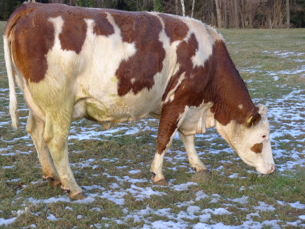 Verkaufe trächtige Fleckviehkalbin aus Anbinde- und Weidehaltung. Abkalbedatum: 30.03.2026. Abzugeben: Ende Februar. Rindermarkt Fleckvieh