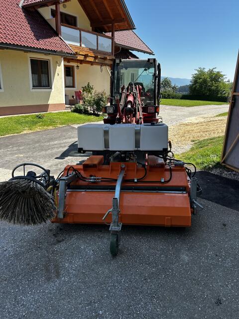 Verkaufe neuwertige Kehrmaschine mit Euroaufnahme und Höhenanpassung, hydr. Sammelwanne, hydr. Seitenbesen mit kombinierter Bürste und Ersatzbürste aus Stahl, Wasser
