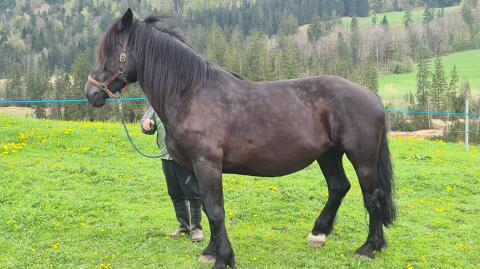 Sehr ruhige, lernwillige Stute mit einem Fohlen. Zurzeit nicht trächtig, im Stutbuch aufgenommen, einspännig gefahren, nicht geritten, aber mein Sohn sitzt manchmal