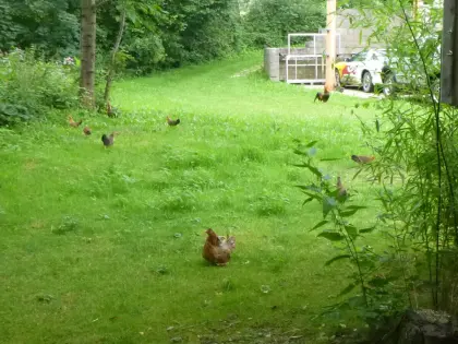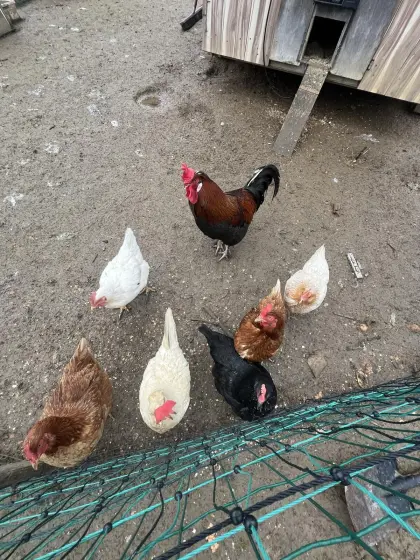 Verkaufe meine Hühnertruppe, weil ich mit den Hühnern aufhöre und mit Enten anfange. In der Truppe gibt es einen Sulmtaler-Maran Hahn, drei Grünleger Hennen, zwei Br
