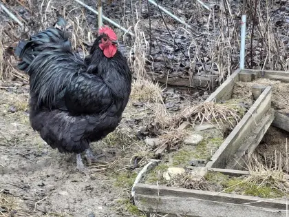 Hahn Blacie ist auf Suche nach einer eigenen Hühnerschar. Frühjahr 2025 geschlüpft, aufgewachsen in Hobby-Freilandhaltung Gebüsch und Wiese, läuft bis jetzt mit der