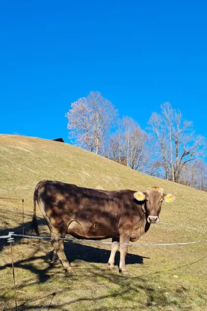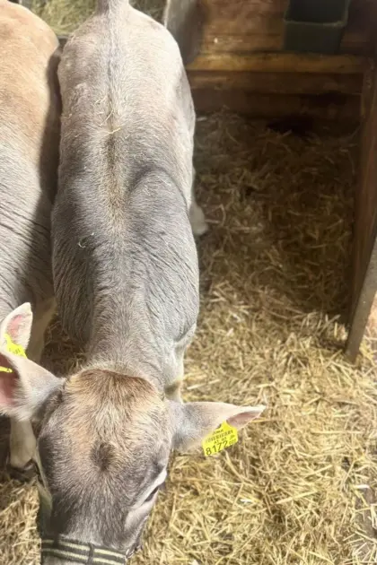 Verkaufe Grauvieh Erstlingskuh, gekalbt 28.9.2025, belegt 14.12.2025. Bewertung 9, 8, 6, 7. Rindermarkt Tiroler Grauvieh