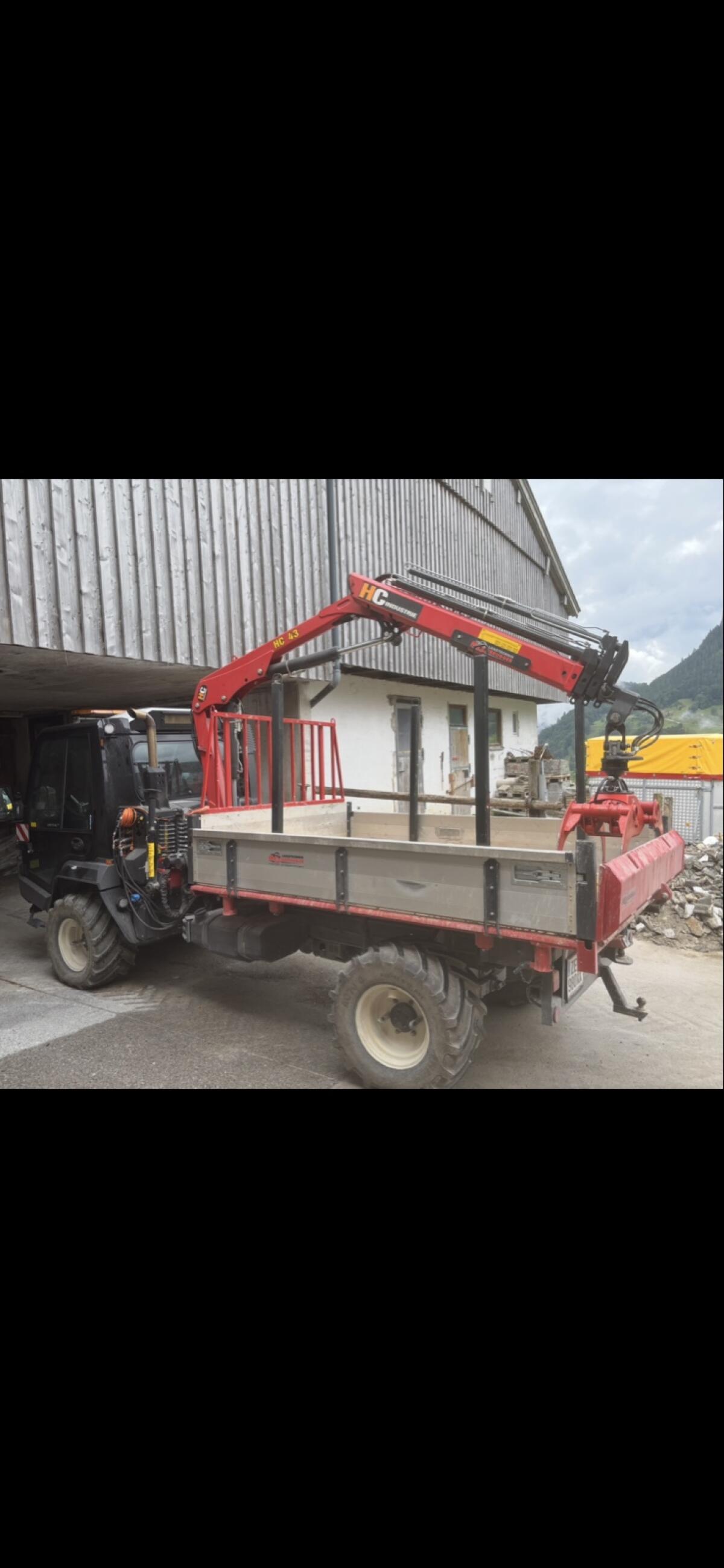 Dreiseitenkipper mit Kranaufbau für Lindner Unitrac mit langem Radstand, Pritschenmaß 2, 8 x 2, 0 m, Boden aus Hardox, Stangenträger vorne, Bordwände aus Alu mit verst