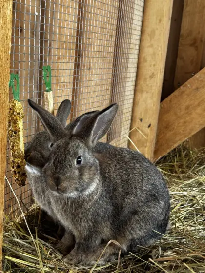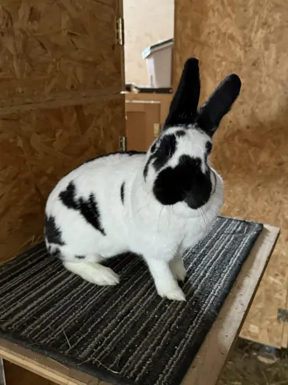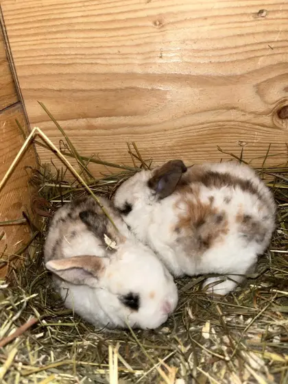 Vergebe eine Mischlingshäsin von 2025, Vater: Blauer Holicer, Mutter: Dreifarbenscheck, Wiegt um die 3, 5 kg bis 4 kg. Kaninchen / Hasen Mischlinge