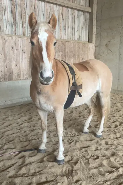 Zum Verkauf steht eine 5-jährige Haflinger Stute mit einem Stockmaß von ca. 1, 46 m. Sie ist eine brave, unerschrockene junge Stute und bereits gut angeritten. Im Umg