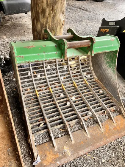 Gitterlöffel mit verstellbarer Größe. Baumaschinen Bagger-Anbauwerkzeuge