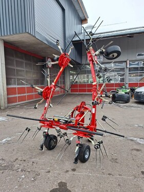 Dreipunkt-Schwenkbock Kat.2, 6 Zinkenreihen, 4-fach einstellbarer Aufbereitungskamm, stufenlos einstellbare Breitstreuvorrichtung, hydr. Stossdämpfer in Schwenkbock,