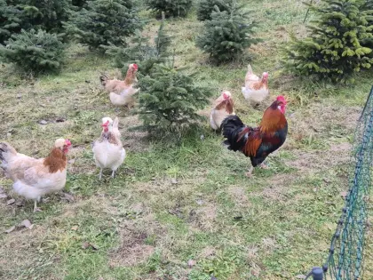 5 Hennen (2-3 Jahre alt), legen noch sehr brav, 3-5 Eier pro Tag. +1 junger Hahn vom Frühjahr 2025. Hühner Sulmtaler