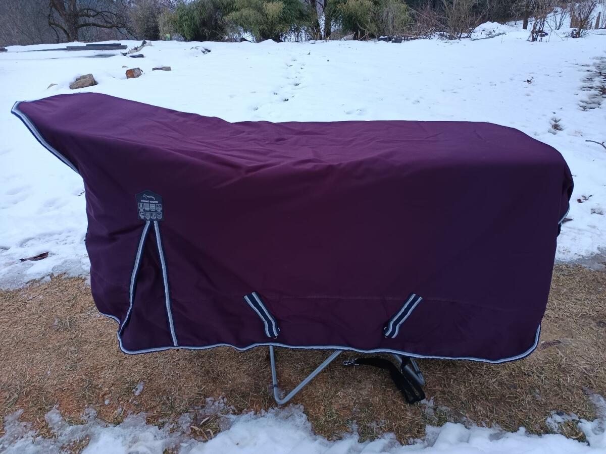 Verkaufe gut erhaltene, professionell gereinigte und imprägnierte Highneck-Winterdecke von Thermo Master. Farbe: Violett-schwarz, 135 cm (obere Länge vom Anfang bis