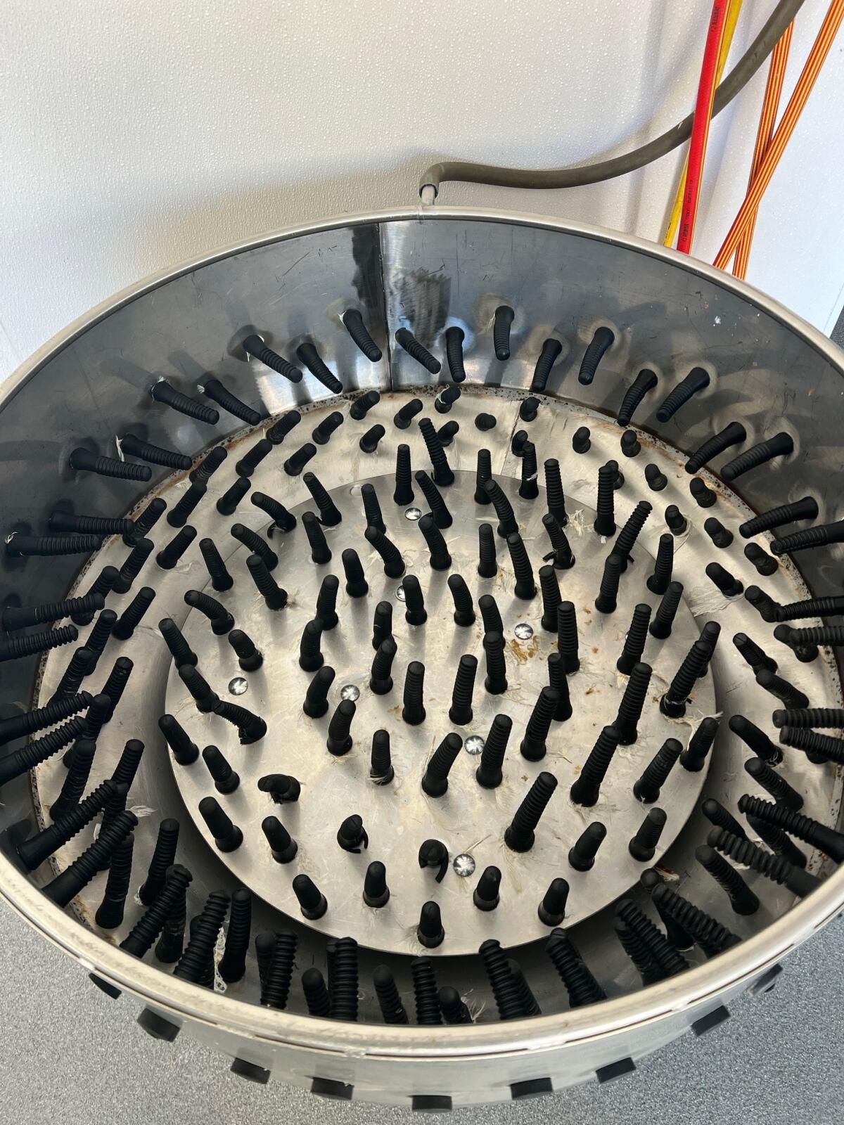 Rupfmaschine für Geflügel aus Edelstahl. Dm. wie am Bild ersichtlich. 400 V Anschluss notwendig, bei Masthühnern mit 2 kg können circa 7 bis 10 Stk. pro Vorgang glei