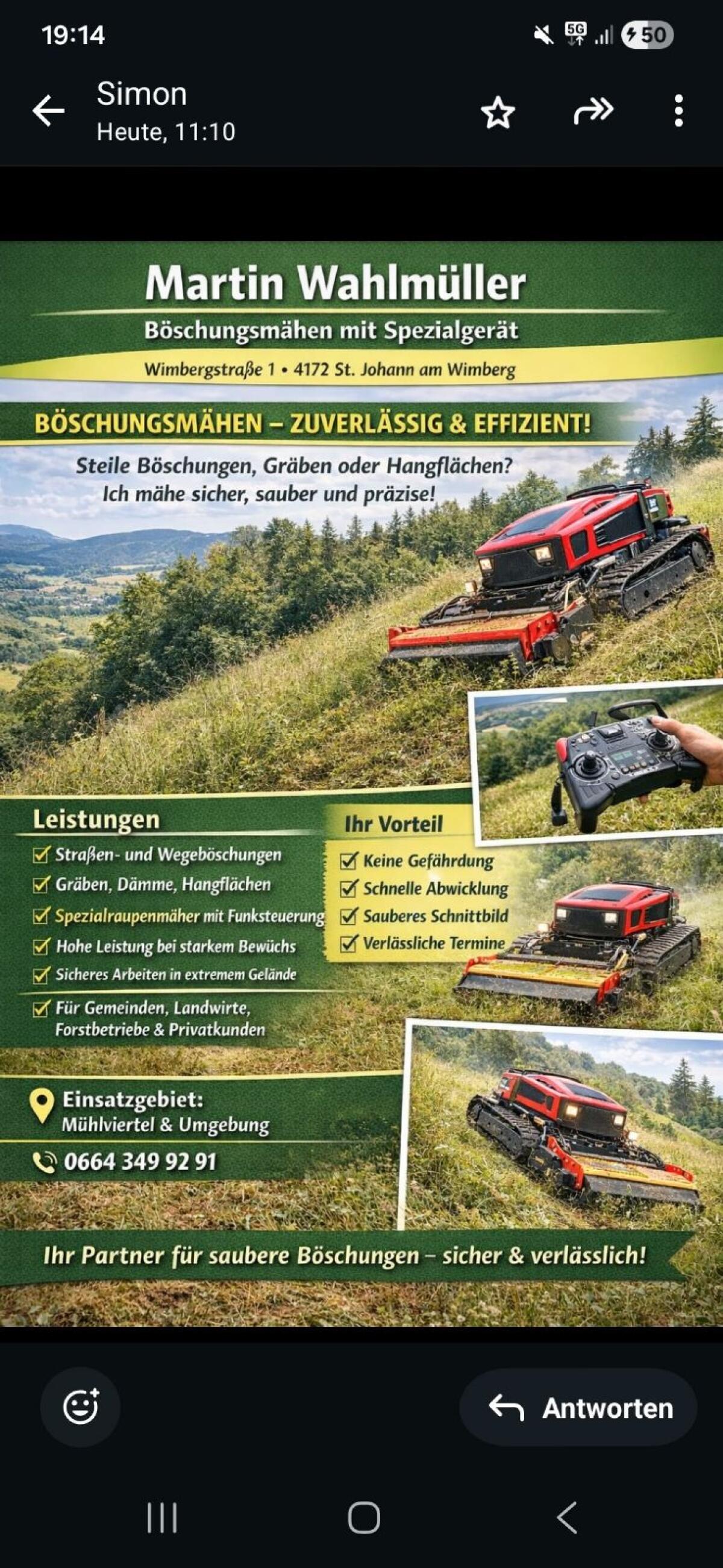 Böschungsmähen in unwegsamem Gelände. Steigung bis zu 45 Grad möglich. Im Raum OÖ und westliches NÖ. Für weitere Fragen gerne melden. Lohnarbeit Böschungsmähen