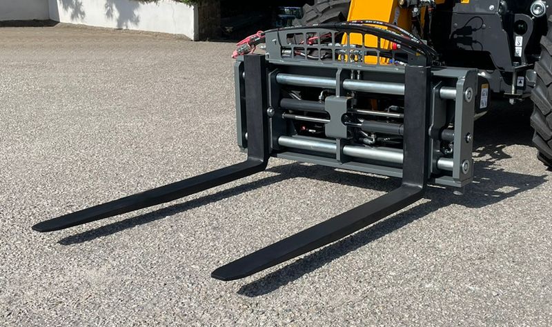 Palettengabel (für Frontlader u. Kompaktteleskoplader) mit hydraulischer Zinkenverstellung, Zinkenlänge: 1200 mm, Tragkraft: 2500 kg, Euro-Aufnahme. Auf Wunsch sind