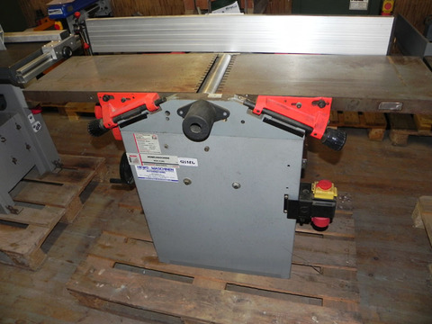 VorführmaschineAluminium-Formatschiebeschlitten (eloxiert) mit gehärteten Stahlführungsstangen. Rückschlagsicherung bei Dickenhobel. Eloxierter Parallelanschlag mit