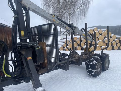 Kesla Rückewagen mit 10 to Nutzlast, hydraulische Bremse auf 4 Räder, Untenanhängung, 4m Rahmenlänge, 2 Zylinder Lenkdeichsel, 4 Rungenpaare, 2 Rungenhalterungen
