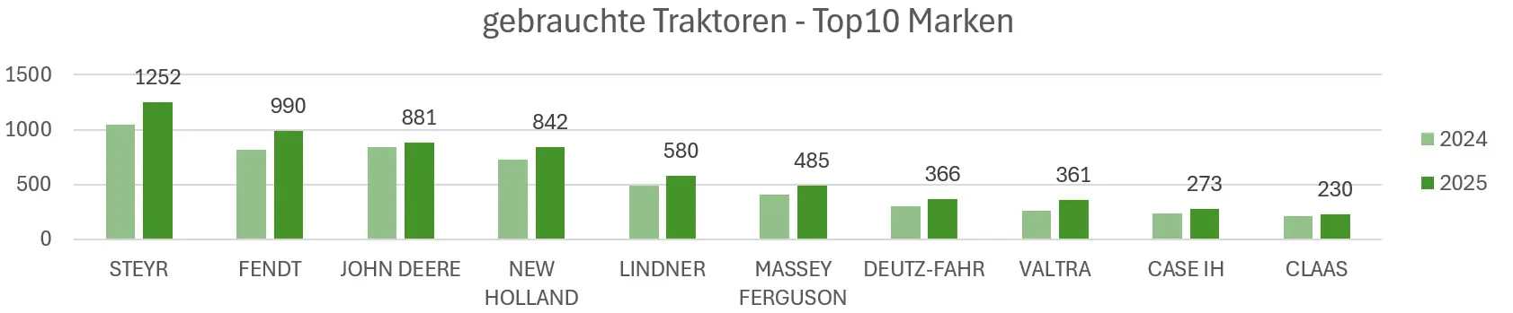 Die Zulassungen gebrauchter Traktoren zeigen ein starkes Wachstum von 9,0 %, wobei das für Händler relevante Segment bis 20 Jahre sogar ein Wachstum von 16,1 % verzeichnete. Dominierend ist das Leistungssegment 50–150 PS. Steyr, Fendt und John Deere führen die Markenstatistik an, die Top-4-Marken vereinen rund 59 % des Marktes.