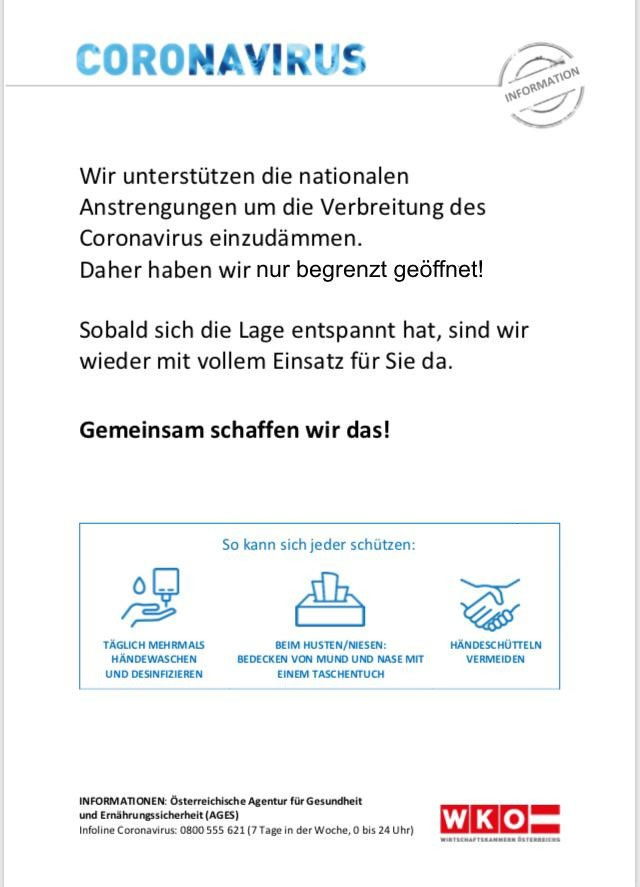 Durch die derzeitige Situation mit dem Corona Virus, werden auch wir unseren Teil dazu beitragen! Der Betrieb läuft mit eingeschränkter Vorgangsweise weiter.