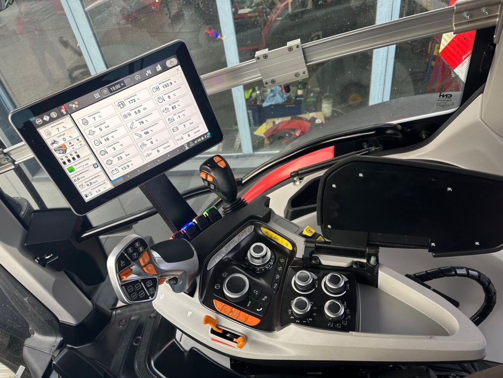 Die Deluxe-Kabine zählt zu den komfortabelsten am Markt: luftgefederter Grammer-Dual-Motion-Sitz, Klimaautomatik, Lederlenkrad, hochwertige Teppichausstattung, Subwoofer-Soundpaket und semi-aktive Kabinenfederung mit Neigungs- & Wankausgleich. Ergänzt wird das Setup durch umfangreiche LED-Beleuchtung, front- & heckseitige Kameras sowie zahlreiche Außentaster für Hydraulik- und PTO-Funktionen.