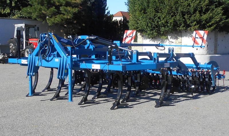 3-balkiger Grubber mit 4 Metern Arbeitsbreite, 14 Zinken, höhenverstellbares Scheibeneinebnungsfeld mit gezackten, gummigelagerten Scheiben, Flügelscharzinken, Federbandwalze und Beleuchtung mit Warntafeln.