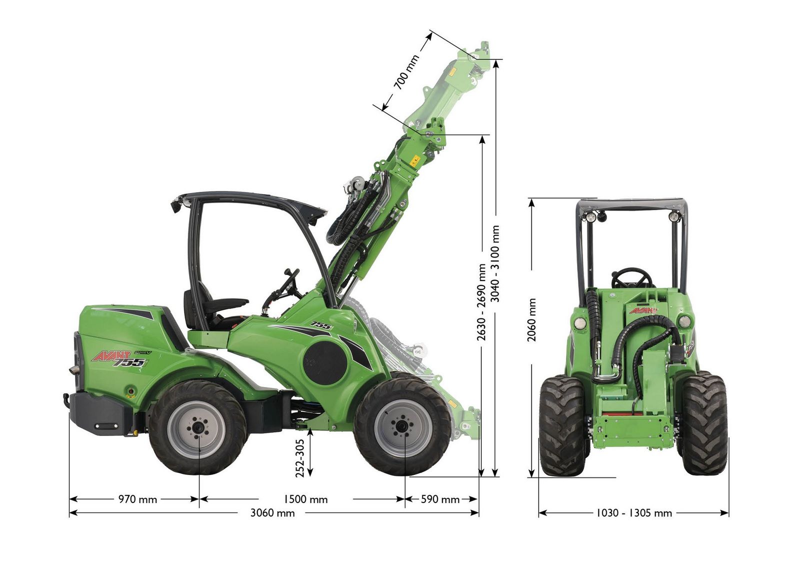 • Doppelwirkende Hydraulik: Die Vielseitigkeit der Maschine wird durch die Fähigkeit, alle Avant-Anbaugeräte zu betreiben, weiter erhöht.