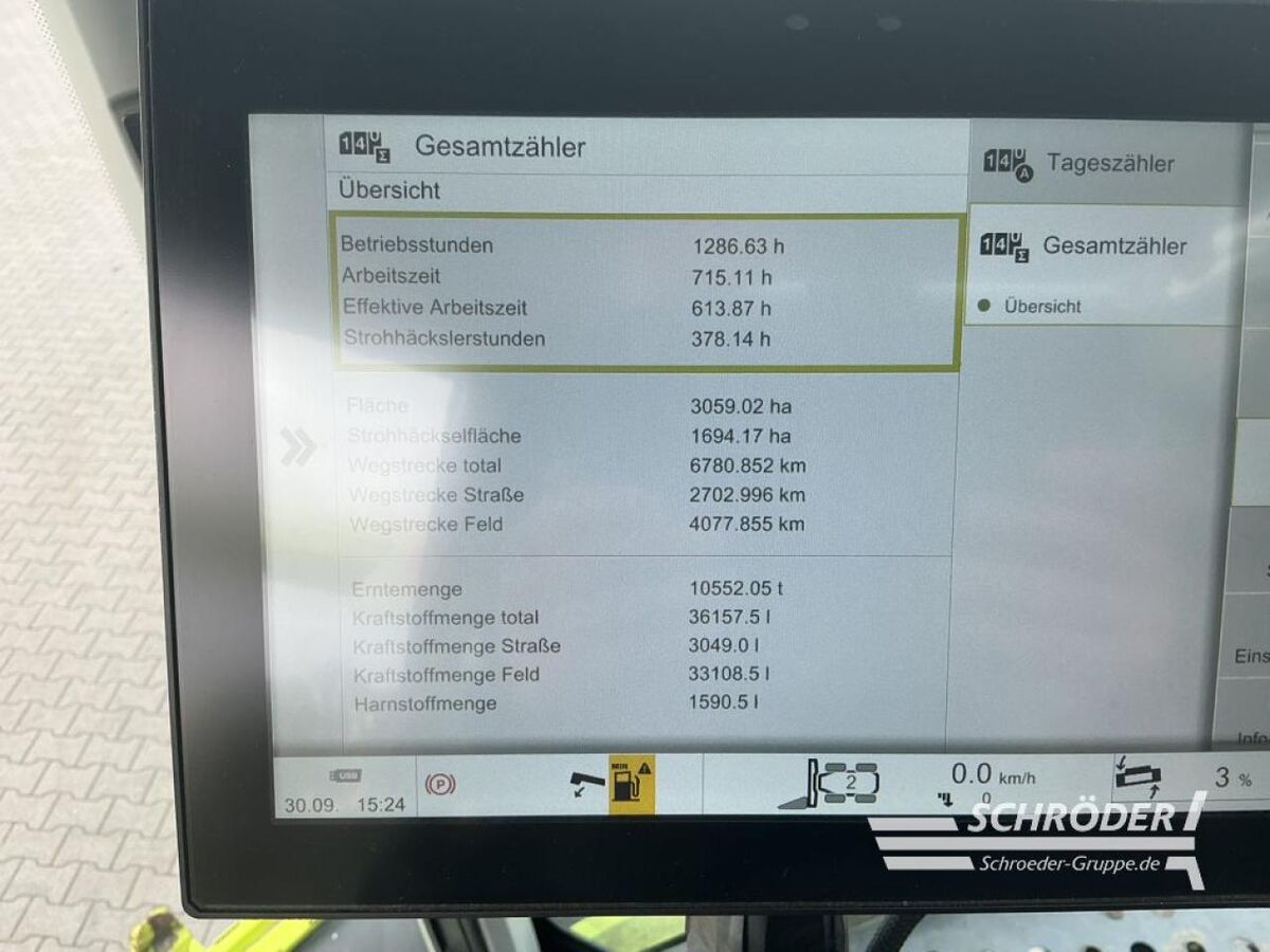 Motorstunden: 1287, Trommelstunden: 715, ., Staubansaugung für Einzugskanal, Schneidwerksbremse, Heizung, Boardcomputer, QUANTIMETER Ertragsmessung, Könerverlustanzeige, Jet Stream 3-D Reinigung, Grainmeter inkl. Überkehr-Volumenmessung mit CEBIS An, Korntankauslaufrohr XXL, 330 mm, Strohhäcksler Häcksler Special Cut mit Radialverteiler, Schwadformer Special Cut für Radialverteiler, Schwadformer, Strohhäckselantrieb inkl. Radialverteiler, Triebachse M - 20-Loch, Differentialsperre, Triebachsenbereifung 680/80 R38 CFO 182 A8, 20-Loch, Lenkachse M einstellbar (8-Loch), Lenkachsenbereifung 500/85 R24 x 275 IMP 8-Loch, LaserPilot links und rechts, Cruise Pilot Durchsatzregler, Ohne