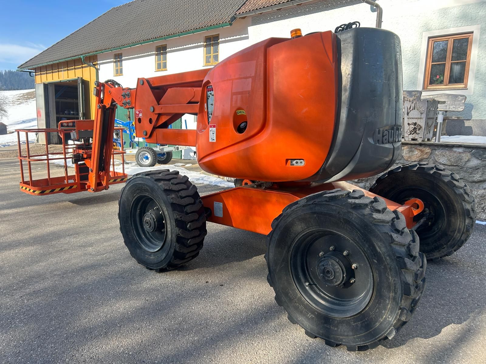 Haulotte HA16PX Arbeitsbühne zu verkaufen Hersteller: Haulotte Modell: HA16PX Baujahr: 2004 Betriebsstunden: 5.857 h Technische Daten Arbeitshöhe: 16,1 m Plattformhöhe: 14,1 m Seitliche Reichweite: 9,1 m Knickpunkthöhe: ca. 6,6 m Tragfähigkeit: 250 kg (2 Personen) Gesamtgewicht: ca. 7.100 kg Transportmaße (L × B × H): ca. 6,95 × 2,30 × 2,20 m Antrieb: Deutz Dieselmotor Steigfähigkeit: 50 % Bodenfreiheit: 40 cm Ausstattung & Merkmale * Allradantrieb * 4 lenkbare Räder für hohe Manövrierfähigkeit * Hydraulische Differentialsperre * Proportionale Steuerung mit gleichzeitigen Bewegungen * 180° hydraulische Korbdrehung * 230-V-Steckdose im Arbeitskorb Besichtigung und Probefahrt sind nach telefonischer Vereinbarung jederzeit möglich.