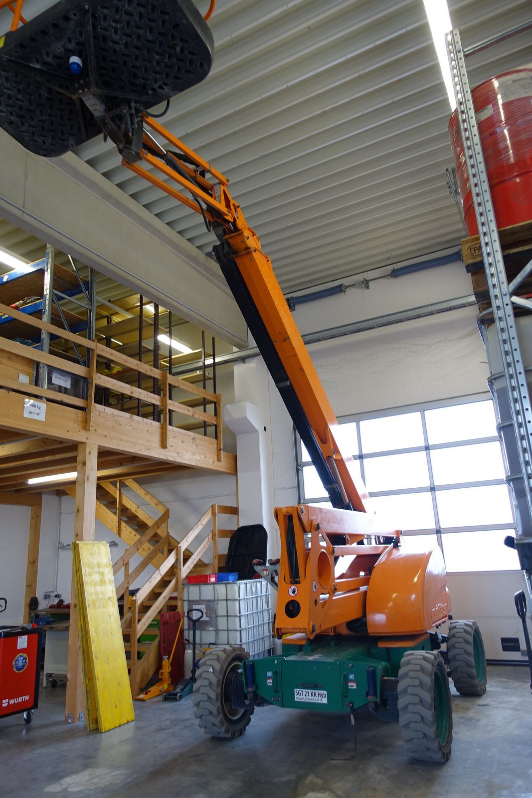 Selbstfahrende Gelenkteleskop Arbeitsbühne mit Korb Arm Baujahr 2013 Betriebsstunden 1.370 Arbeitshöhe 20,76 Meter Korb schwenkbar 180 ° Korbnutzlast 350 Kg Gesamtlänge 8.54 Meter Breite 2.41 Meter Höhe 2.51 Meter Gewicht 9.885 Kg Antrieb Batterie, Diesel-Hybrid Allrad