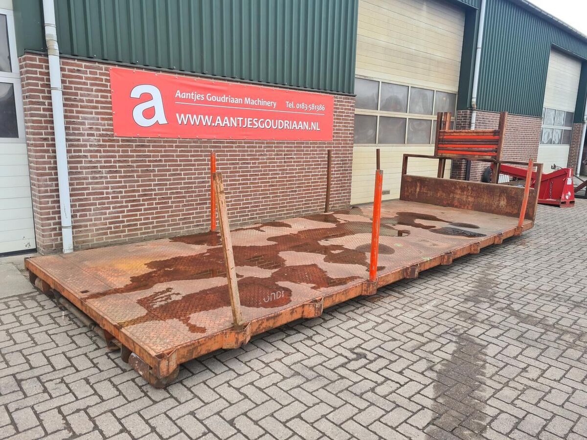 == Overige details (NL) == Container flat • Geschikt voor kettingsysteem ( haak of kabel optie ) • Afmetingen 6500x2400 mm • Haakhoogte 1450 mm • Traanplaatbodem • Rongen • Looprollen • Bindhaken • Meerdere op voorraad Staat: Gebruikt