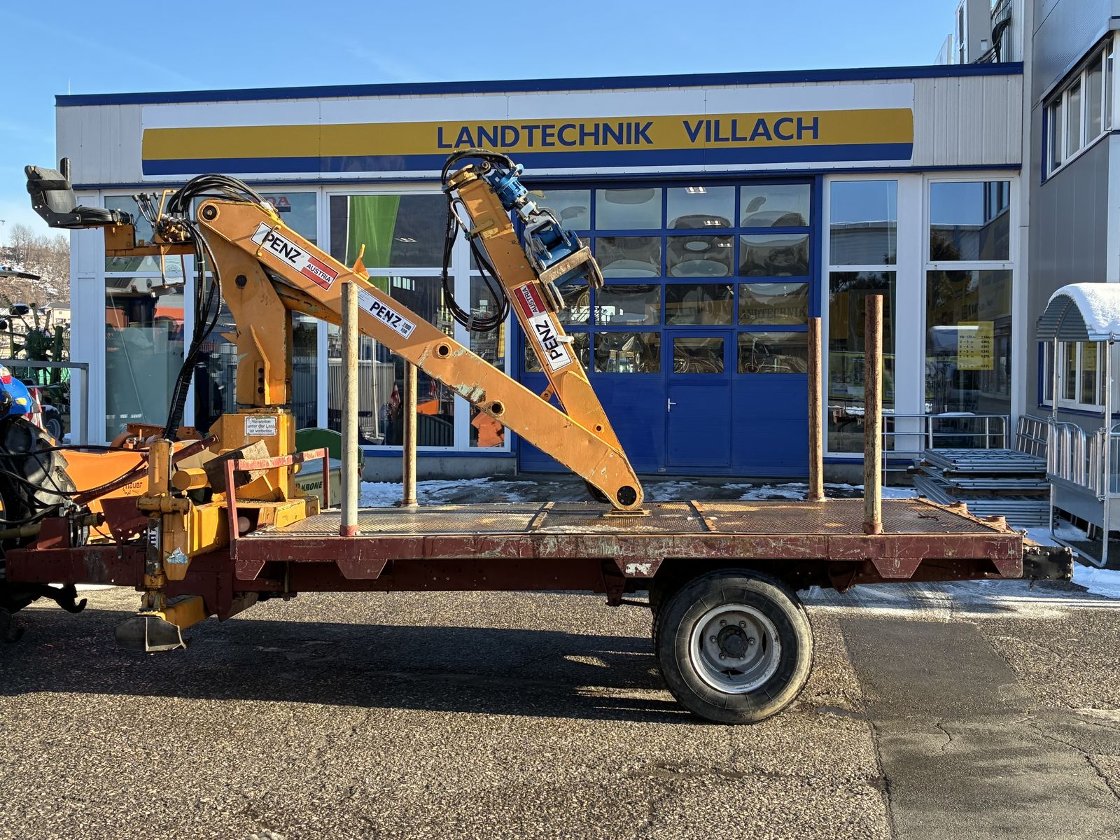 Forstanhänger mit starken Rahmen und geschlossene Ladefläche (Plateau) mit Stahlboden, 2 Rungenpaare, Beleuchtung, Zwillings-Bereifung, Penzkran 6,7 m mit Teleskopausschub, Hochsitz, Hubkraft bei 4 m Reichweite 1400 kg, Schwenkwerk mit 2 Zylinder, Versorgung über Eigenölversorgung, Endlosrotator mit Pendelbremse, hydraulische Holzzange, Flapdown-Abstützung, einsatzbereit, prompt verfügbar.