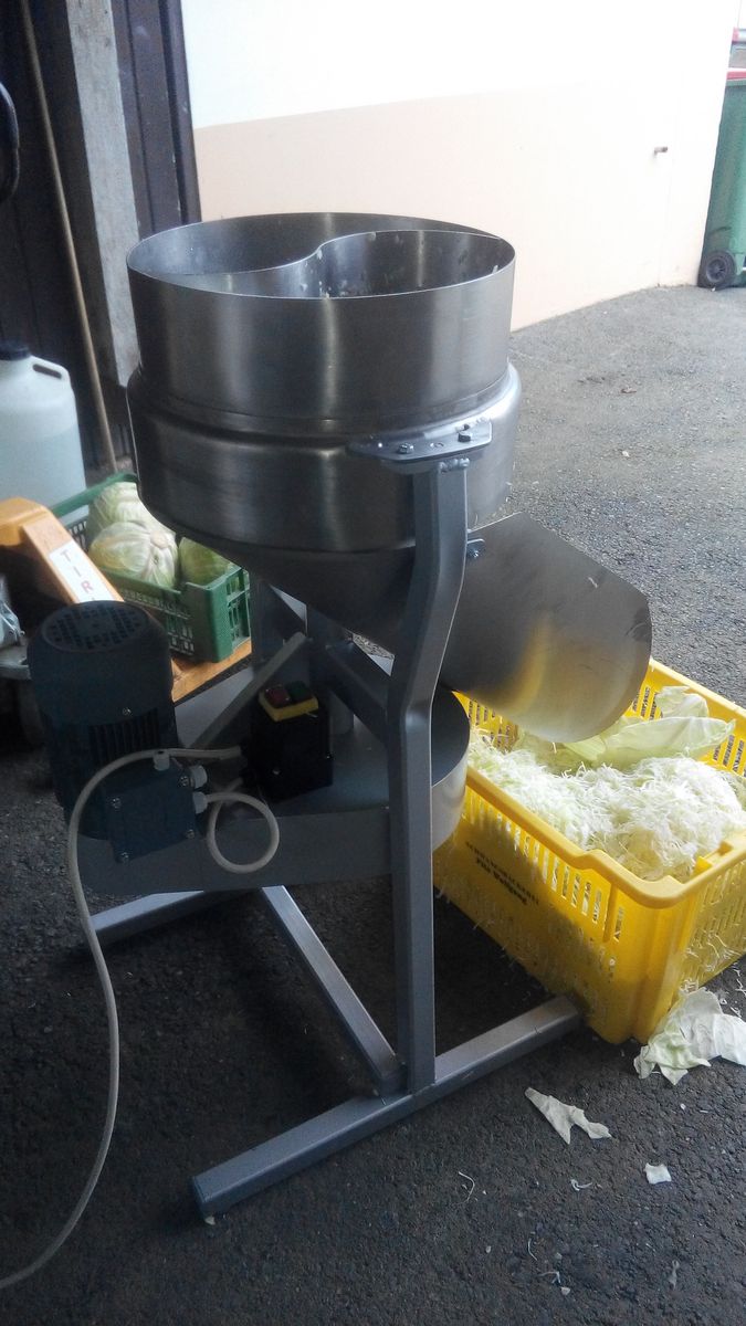 Elektrischer Krautschneider für Sauerkrautproduktion. Antrieb mit Elektromotor 0,75 kW, Leistung ca. 500 kg/Std. Alle Teile, die mit Gemüse in Berührung kommen aus Nierost, der Rest pulverbeschichtet. Messer fünfteilig, eingestellt auf 1,3 mm, ideal für Sauerkraut. Mit zusätzlichen Messern kann man rote Beete, Karotten, Sellerie und anderes Gemüse verarbeiten. Anlieferung bis zum Hof.