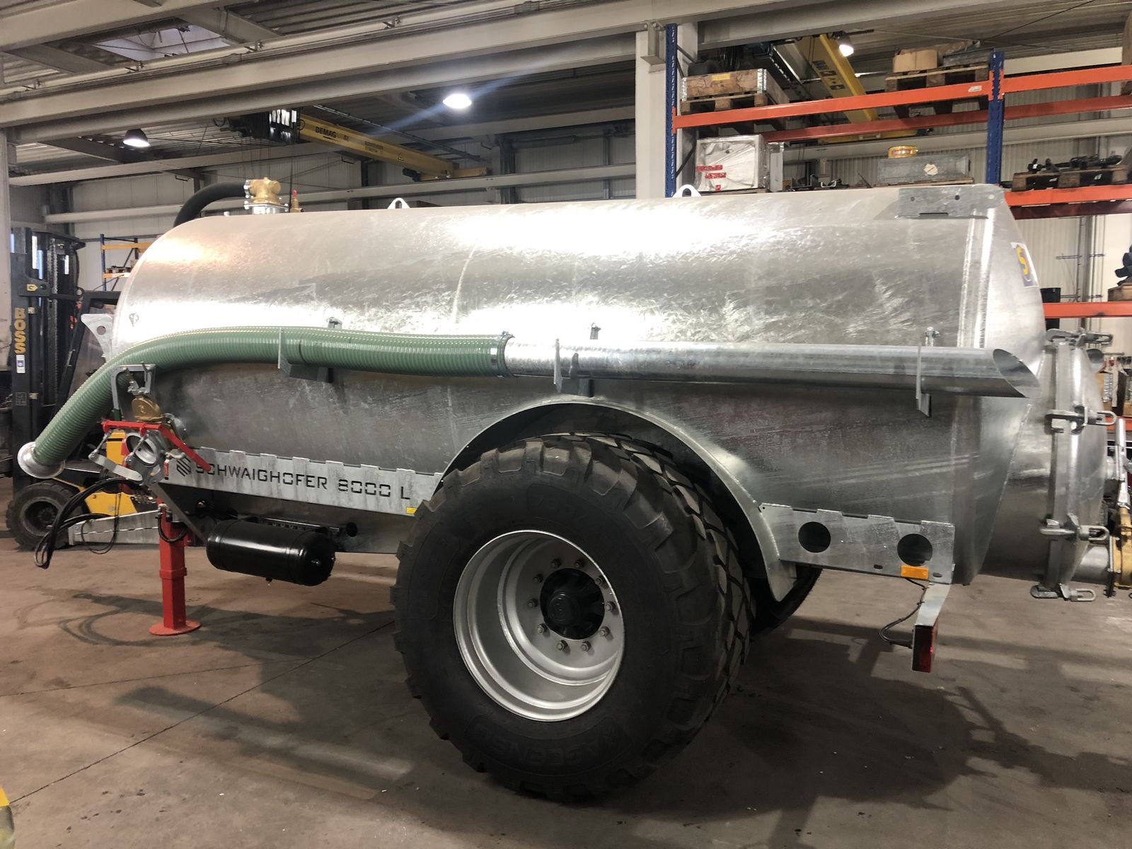 SCHWAIGHOFER 8000-Liter Einachsvakuumfass, Kompressor MEC 8000 mit gepresster Schmierung, Weitwinkel-Gelenkwelle, Doppelkugel-Domventil, Siphon-Sicherung, 6" Sauganschluss li. oder re. mit Schnellkuppler, 5m Saugleitung (3m Schlauch und 2m Rohr), hydr. Schieber hinten, Untenanhängung mit Flanschzugöse Ø40mm, hydr. Stützfuß, 2-Leiter DL-Bremse mit ALB-Regler, 25km/h Land und Forstwirtschaft, Vorbereitung Sauganschluss hinten, Vorbereitung Talentleerung, Vorbereitung Twin-Tank-System, Vorbereitung Schleppschuhverteiler - Verteiler gegen Aufpreis erhältlich (Möscha, Schleppschuh,....), Vorführfass, ab März verfügbar.