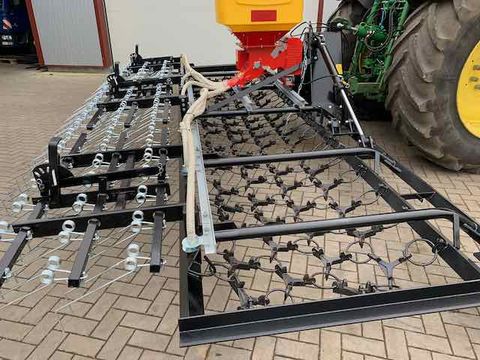 - Extra modifizierte Wiesenegge - Wiesenegge mit Striegel und Pneumatische Nachsaateinrichtung. - 6 m Arbeitsbreite - stabiler Anbaubock, extra stabile Bauweise - verstärkte Drehgelenke - Kettennetz mit 4 Reihen - Kettennetz drehbar mit mehr Griff - 2 Planierschinen vorn 1 x hinten - hydr. Klappung mit 2 DW Zylinder - Wiesenstriegel mit 3 Zinkenreihen - gefederte Zinken mit 8 mm Stärke - Zinken können mech auf Neigung eingestellt werden - Anhängung KAT II. / III - Pneumatischer Streuer mit Steuerung und 8 Ausgängen mit Prallteller - Geschwindigkeitsabhängige Ausbringung über 7 Polige Signalsteckdose Profi Speed Steuerung mit Abschaltsensor - Profisteuerung mit Mengenverstellung aus der Kabine - 300 ltr Tank elektrischer Antrieb mit 2 Doppel - Turbogebläsen - auch in 5m oder 8m verfügbar - Lieferung Europaweit möglich - der Preis ist inkl 19% MwSt
