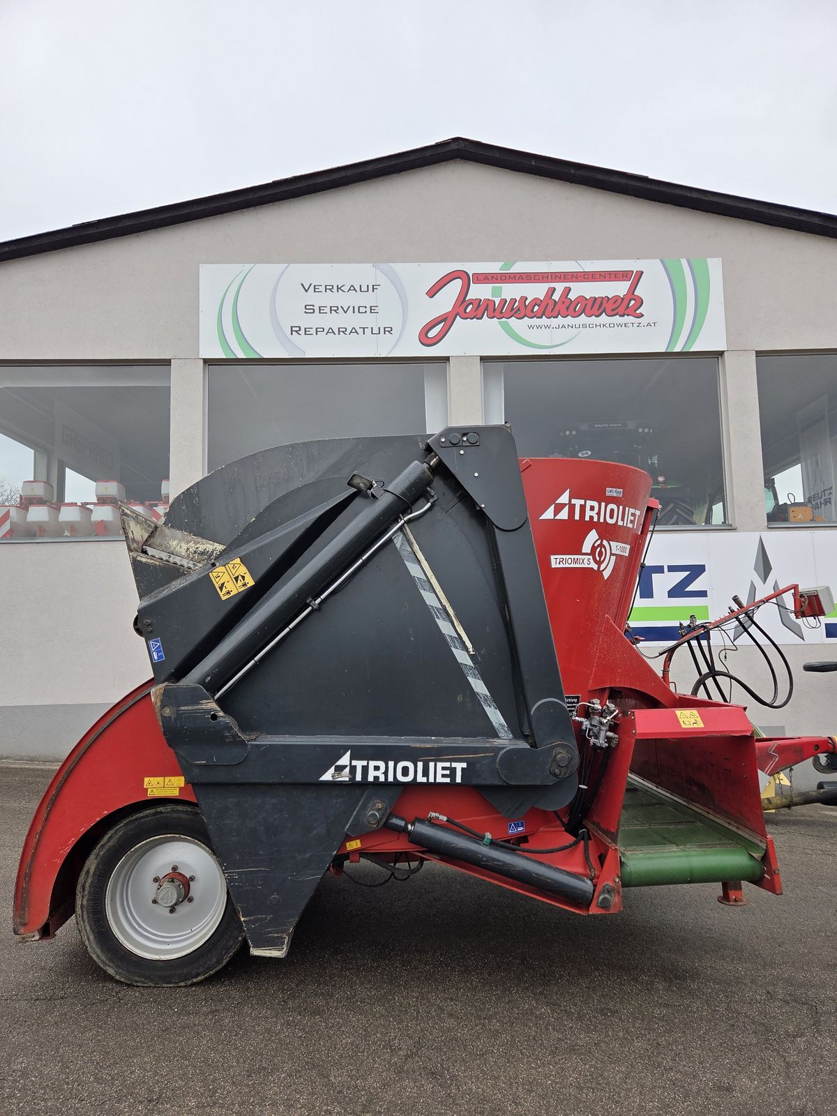 Ausstattung: •Ein Kontramesser • Verschleißrand • U-förmiges Stanz- Ladesystem mit Trioliet Stanztechnik • Weitwinkelgelenkwelle • Querförderband an der Vorderseite (b=0,75m) • Verstellbare Zugdeichsel für Oben- oder Untenanhängung, montiert für Obenanschluß • Eine Twin Stream Vertikalmischschnecke (15mm Schnecke/18mm Dosierschaufeln) • 2 Leiter Druckluftbremse • Abdichtbürste für Ladeklappe • Zwei Einzelräder • Elektrische Fernbedienung + Wiegeeinrichtung • Trioform Schneidmesser kurz - Serie • Hydraulischer Stützfuß • LED Arbeitsscheinwerfer + Kamera Preis gilt für aktuellen Zustand! Angebot freibleibend, Irrtümer, Änderungen und Zwischenverkauf vorbehalten! Das Verkaufsteam der Fa. Januschkowetz zeigt Ihnen das Gerät / Maschine gerne und bittet um Terminabsprache zwecks Besichtigung bei uns am Betrieb.