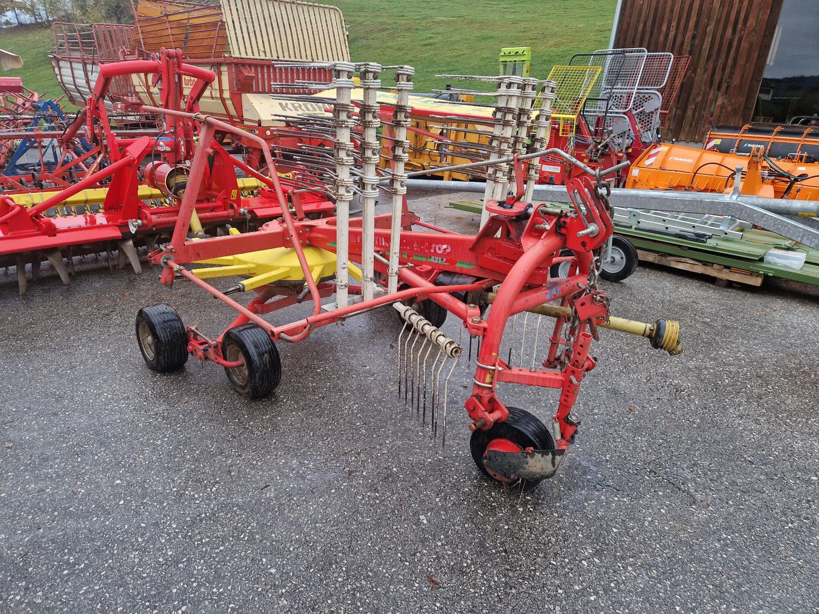 Pöttinger Kreiselschwader TOP 421 N, mit Tastrad, Schwenkbock mit 2x Dämpfungsstrebe, abnehmbare Zinkenarme, klappbare Schutzbügel, Schwadtuch, Tandemfahrwerk, Höhen