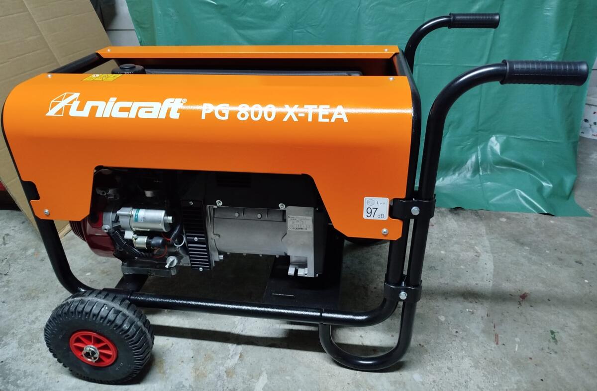 Umständehalber ein unbenutzter Stromgenerator bzw. Notstromaggregat vom Hersteller Unicraft. Baugleich zum Produkt Pramac-Unicraft mit 18 Liter Benzin Tank-AVR Steuerung. Ein Thermoschalter und Ölmangelabschaltung. Das Starten per Zündschlüßel oder mit dem Starterseil. Erdungsanschluß über die PE Klemme, ein Voltmeter, ein Stundenzähler und ein Sicherungskasten sind ebenfalls vorhanden. Modell: PG 800 X-TEA mit Handstart / E-Start Benzin Stromgenerator Honda GX390 Höhe mit Griff: 77cm, Breite mit Räder: 78cm, Länge mit Griff: 110cm 1 x 230 Volt , 1 x 400 Volt Scheinleistung bei LTP 4,0 / 8,3 kVA Wirkleistung bei LTP 3,6 / 6,6 kW Bei Interesse bitte melden. Probelauf möglich. Keine Garantie !