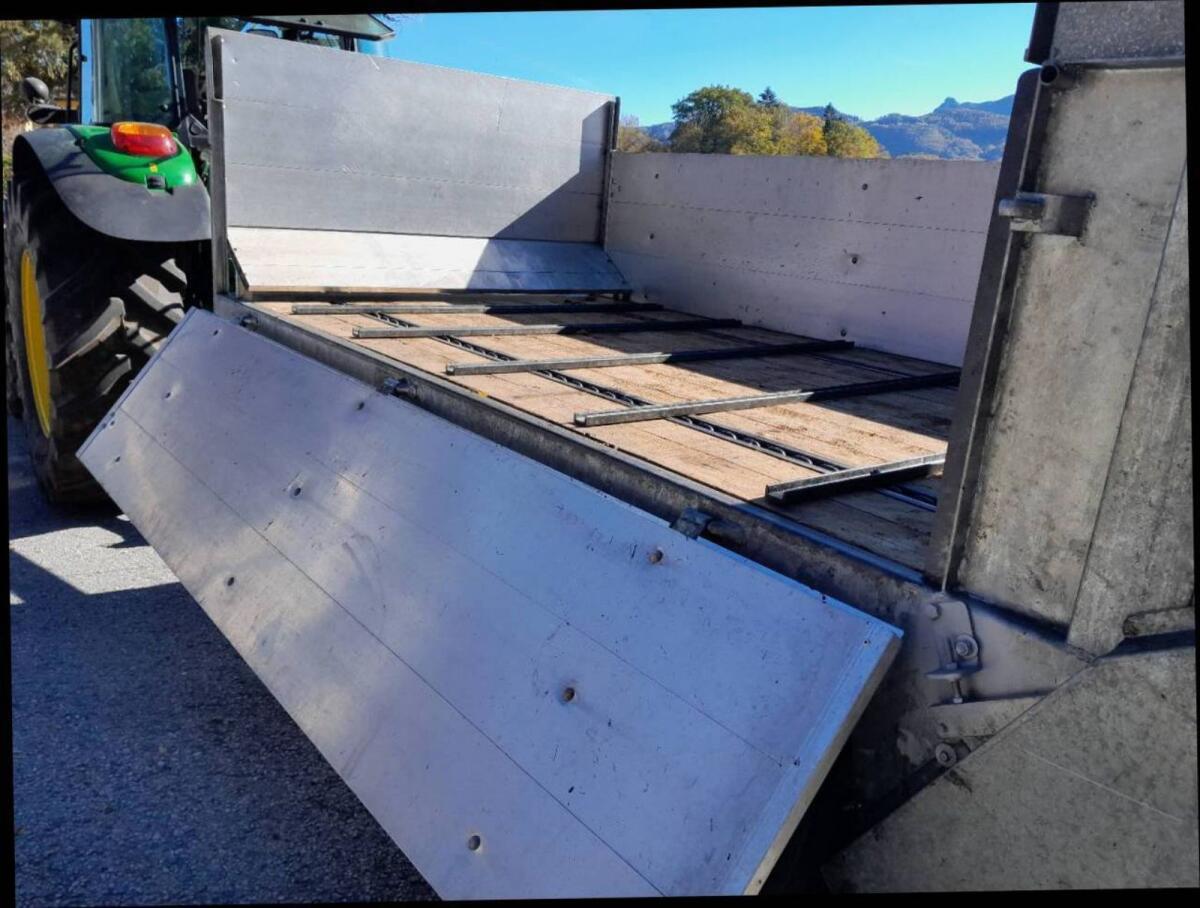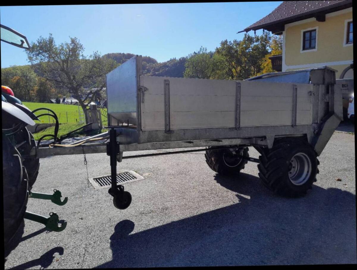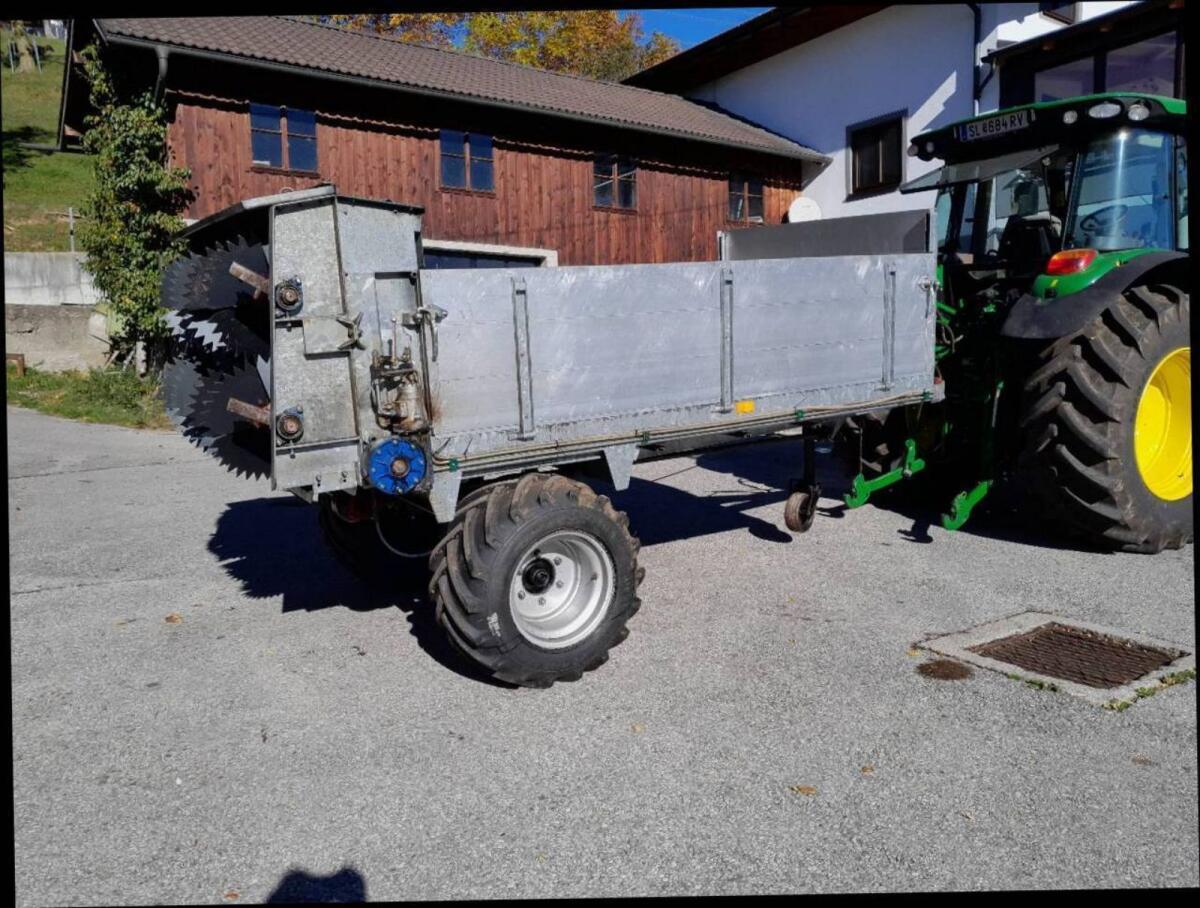 Miststreuer, fast ca. 3 m³, massiver Eigenbau eines Maschinenschlossers, Fahrgestell verzinkt, Alubordwände klappbar, Ladefläche ca. 2,60x1,60x0,6 m, AS-Bereifung 19,0/45-17, Kratzboden kann in beide Richtungen laufen, wurde selten benutzt, nach jedem Gebrauch wieder gereinigt, abgeschmiert, konserviert und in der Garage abgestellt.