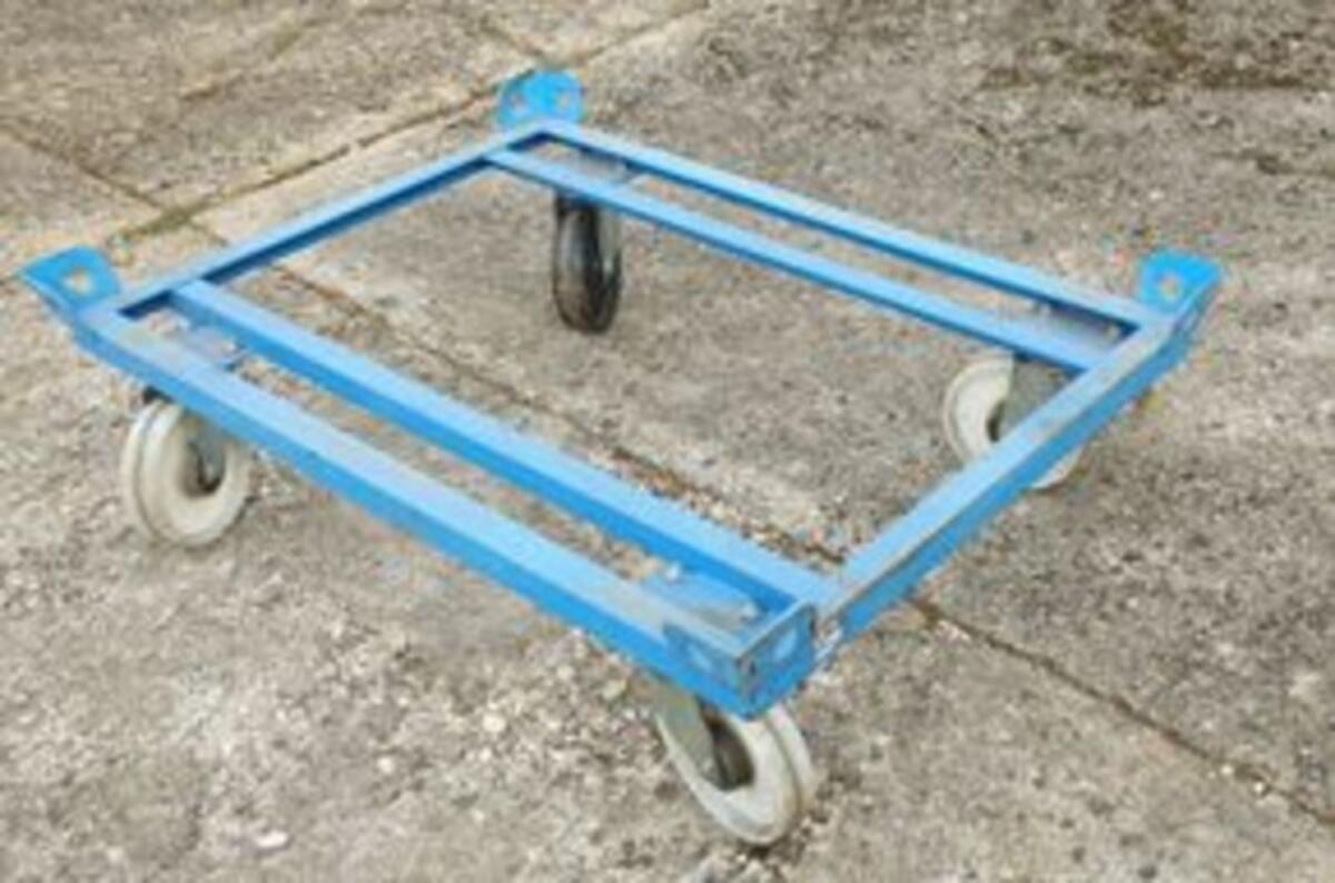 Fahrgestell für Flachpaletten und Gitterboxen, 1.000 kg Tragkraft, Abmessung 120 cm x 80 cm, vier Fangecken, vier lenkbare Räder mit Bremsen, robuste Winkelstahlkonstruktion, mehrere Stk. verfügbar.