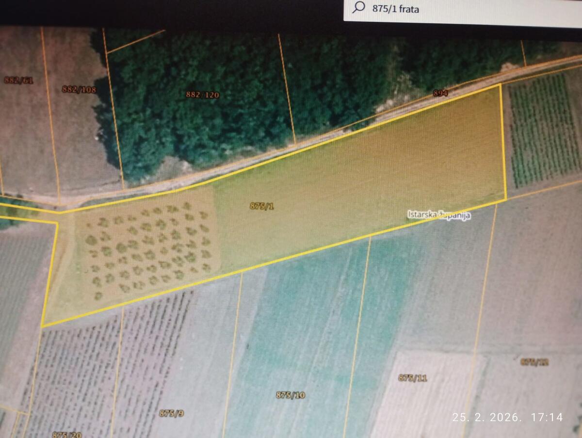 Prodajem poljoprivredno zemljište koje se nalazi 5 km od mora, kraj Poreča u Istri (Hrvatska). Na zemljištu istih je 60 mladih maslina, koje su prošle godine dale 1.000 kg ploda masline. Parcela ima ucrtani pristupni put i pravokutnog je oblika površine 10000 m2.