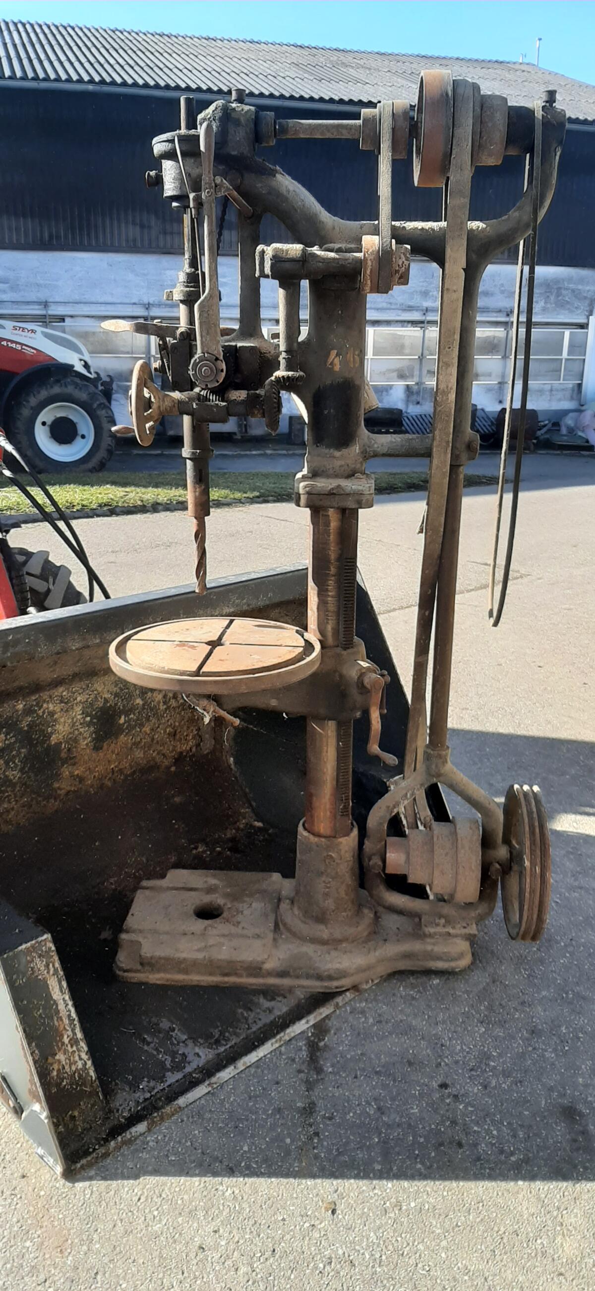 Sehr alte Ständerbohrmaschine, mit zusätzlichem E-Motor würde sie wieder komplett funktionieren.