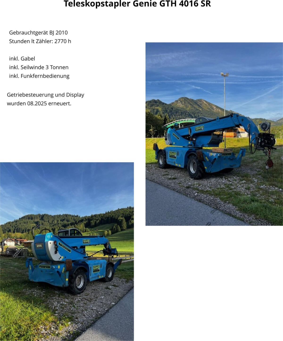 Teleskopstapler Genie GTH 4016 SR – Gebrauchtgerät in gutem Zustand, Bj. 2010, ca. 2.770 Bstd., Tragkraft: 4.000 kg, Hubhöhe: 16 m, Ausstattung: Montagearm (4 m), Ga