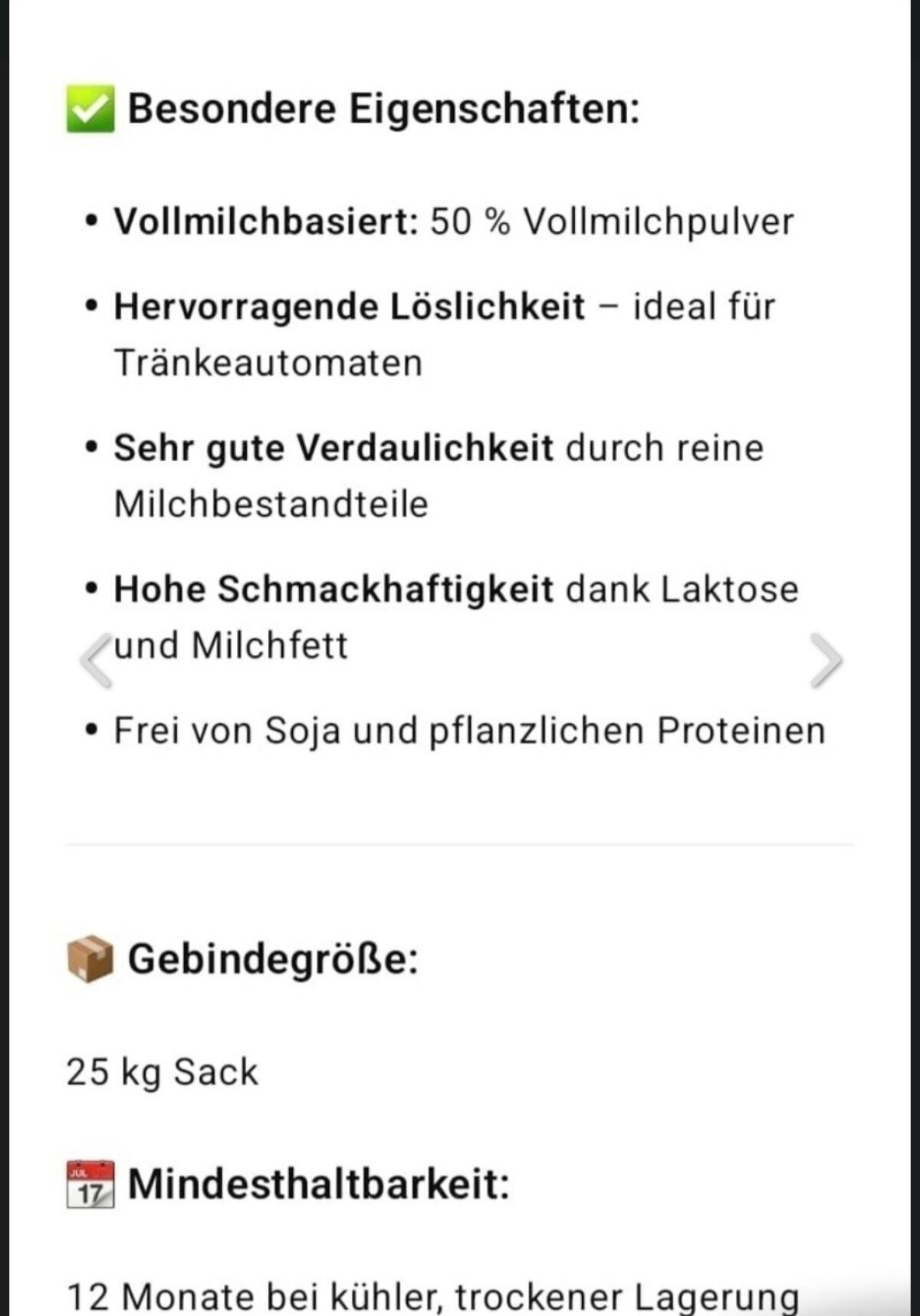 Milchaustauscher mit 50% Vollmilchpulver. Zutaten: Vollmilchpulver, Magermilch, Molkenpulver, Molkepulver teilentzuckert, Milcheiweiß, Traubenzucker und Vitaminen. A