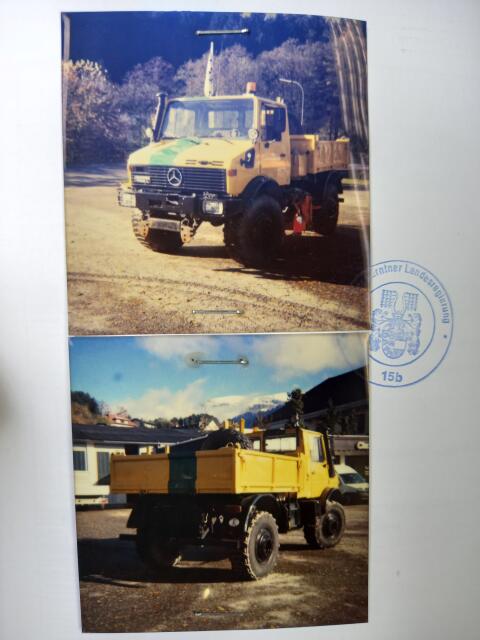 Unimog mit kompletter Anschlussgalerie für Schneepflug usw., seitliche Grader-Vorrichtung, Kipper und unter dem Kipper ist eine Seilwinde mit Fernsteuerung montiert,