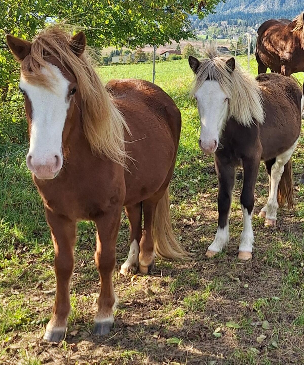 Stute, 3 Jahre, kein Ekzem, keine Allergien, Endmaß 130 cm, ein blaues Auge. Wallach, 1 Jahr, Windfarbhelmschecke, kein Ekzem, keine Allergien, Endmaß ca. 136 cm, 2