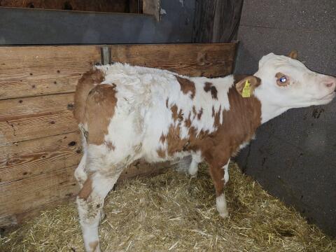 Verkaufe ein Mischlings-Stierkalb (25% Fleckvieh und 75% Braunvieh), geboren am 08.09.2025. Das Kalb ist gesund, vital und gut entwickelt, zeigt eine gute Bemuskelun
