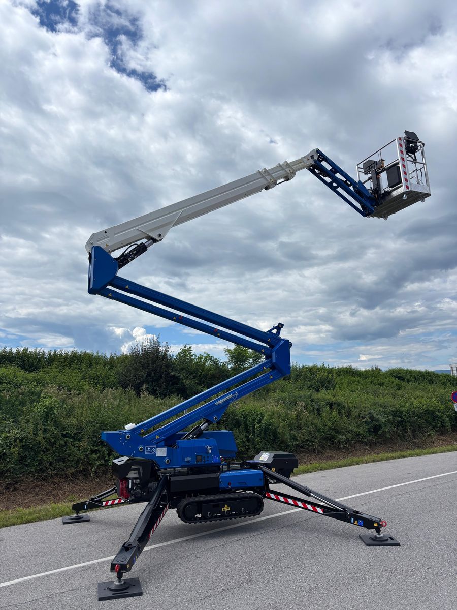 Raupenarbeitsbühne Blue Lift SA 18 HB, Baujahr 2025 Arbeitshöhe: ca. 17,80 m Reichweite: ca. 9,30 m (120 kg) Gesamtbauhöhe eingefahren: 1,995 m Gesamtlänge: 4,44 m Länge ohne Arbeitskorb: 3,75 m Gesamtbreite: 0,780 m Korbgröße: 1,30 x 0,70 m Drehbereich: 340° Tragfähigkeit der Arbeitsbühne: 230 kg Gewicht: 2.390 kg 230 V / Benzin (Honda Motor iGX390 15 HP) Lackierung zweifarbig: Grundgestell, Stützen, Einschließlich folgender Sonderausstattungen: Unterlegplatten samt Halterung Funkfernbedienung Einfahrautomatik Verstellbare Laufbahnbreite Luft/Wasser Anschluss