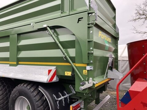Fortuna-Tandem-Muldenkipper zul. Gesamtgewicht: 24.000 kg Stützlast: 4.000 kg Ladevolumen (mit Aufsatz): ca. 40,1 m³ Zugöse: 80 mm Kugelkopfkupplung Zugdeichsel: starre Ausführung Abstützung (vorne): hydraulischer Stützfuß Muldenboden: 4 mm Stahl S355, Muldenwand: 4 mm Stahl S355 WAVEDESIGN Muldenmaß: 7.500 x 2.200/2.250 mm Muldenhöhe: 1.500 mm inkl. Sichtfenster und Plexiglasscheibe Muldenaufsatz: 900 mm Heckklappe: hydraulische Heckklappe Kornschieber: mit Hebel und Schütte, Schütte abnehmbar Hy­drau­lik­zy­lin­der: 3.490 mm Hub, 6-stufig, Ölbedarf: ca. 46 Liter Ab­sperr­hahn am Hy­drau­lik­zy­lin­der: serienmäßig Kippwinkel: ca. 52 Grad Nenndruck der hydr. Anlage: ca. 190 bar Bremsanlage: Zweileitungsdruckluftbremse inkl. automatisch lastabhängigem Bremsventil (ALB) 24 t. Luftfederung Radanschluss 10-Loch Achsquerschnitt 150 x 150 mm Bereifung: 710/50 R 26.5 Kotflügel: 40 km/h Ausführung Un­ter­fahr­schutz: 40 km/h Ausführung Beleuchtung: Lichtanlage nach StVZO auf 12 Volt LKW-Rückleuchten: serienmäßig Spur­be­gren­zungs­leuch­ten Sei­ten­ma­kie­rungs­leuch­ten Lackierung: in Fortuna-Grün, Abnahme inkl. TÜV - Gutachten