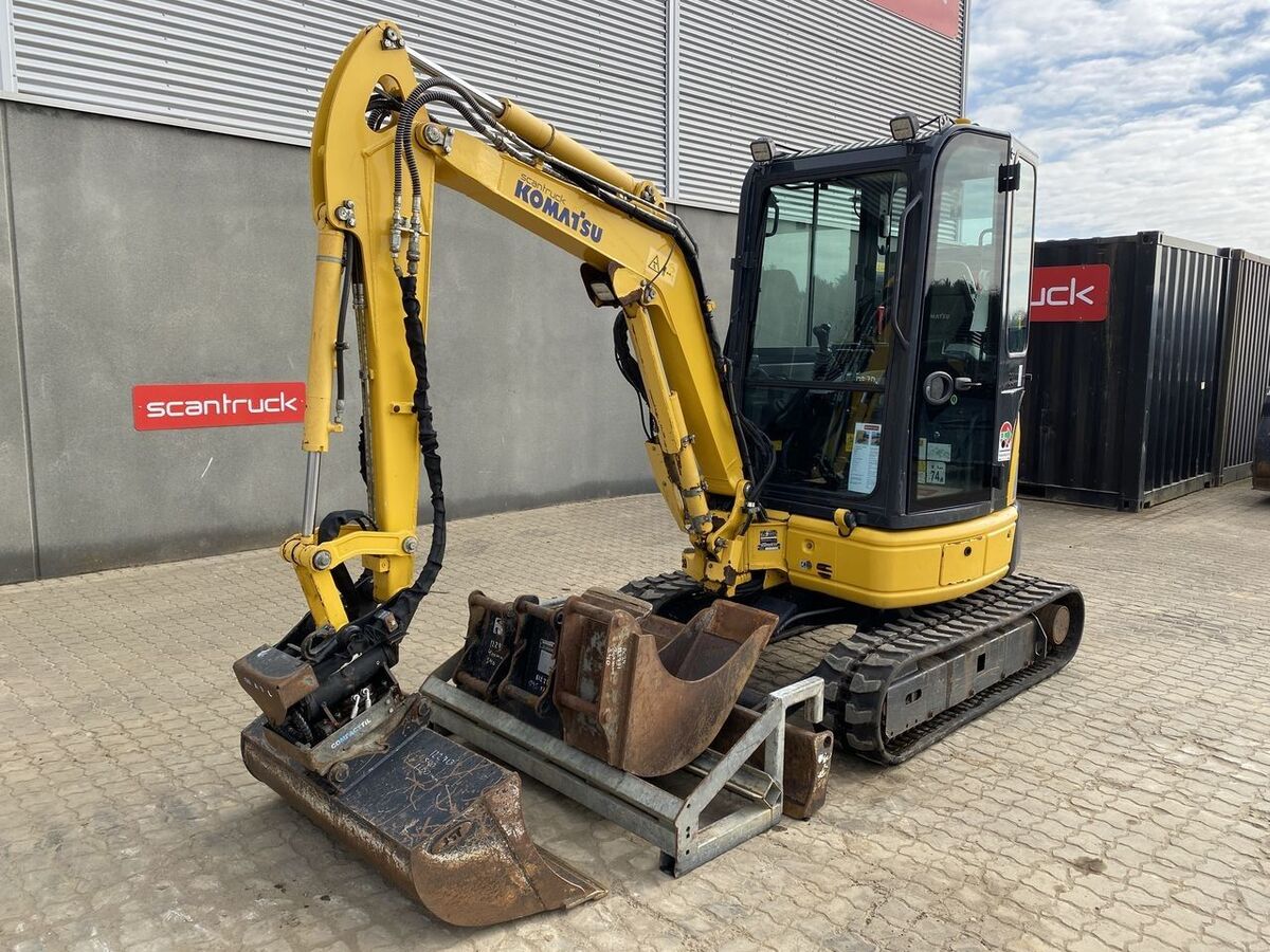 == More details (EN) == Classification: C Boom: Mono boom Attached equipment, digging arm: Graveskovl u/tænder 600mm, Graveskovl u/tænder 400mm, Graveskovl u/tænder 300mm, Planerskovl - fast 1300mm, Shovel rack for digging shovel, Compacttilt Tiltrotator S40 Skifte Wheel / undercarriage: Dozer blade front Undercarriage: Rubber belts Track shoes width: 300 Battery (V): 12 Arm lenght: 1370 mm Komtrax monitoring LED light rear on cab roof LED light on boom LED lights front on cab roof (2EA) Ekstra hydraulik proportionalstyret Hydraulic pressure keeping valve on boom Hydraulic pressure keeping valve on stick 2 kreds. proportionalstyret Joystick
