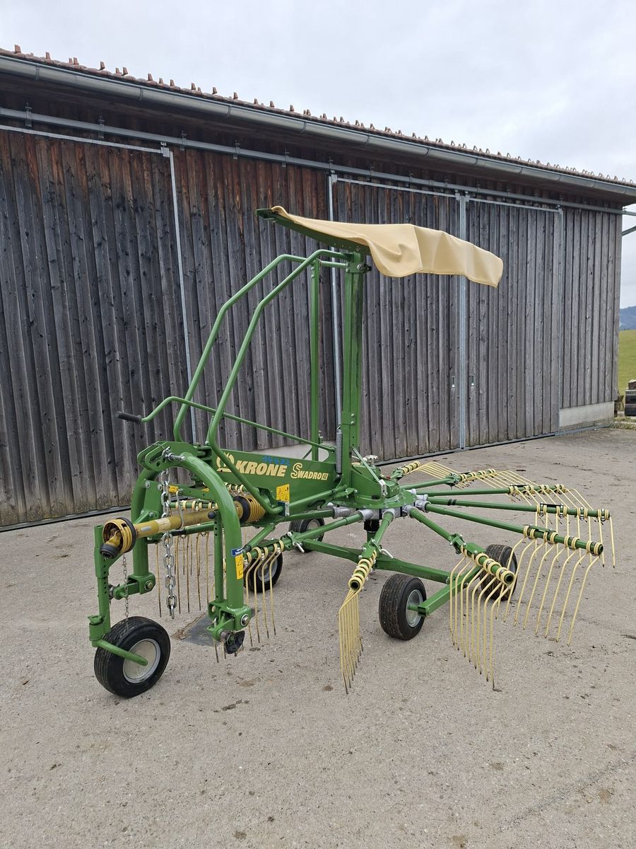 Einkreiselschwader -3-Punkt-Anbau -Arbeitsbreite 4.200 mm -Transportbreite ca. 2.265 mm -Gewicht ca. 640 kg -13 Zinkenarme, davon 7 klappbare Zinkenarme -4 Doppelzinken pro Arm -Zapfwellendrehzahl 540 U/min -Tandemfahrwerk 4 x 16/6.50 - 8 -Leistungsbedart ca. 37 kW (50 PS) -Dämpferstreben mit innenliegenden Druckfedern für optimales Nachlaufverhalten in Kurven, bei hohen Geschwindigkeiten sowie Hangabwärtsfahrt -Selbstzentrierung des Schwaders beim Ausheben -Patentierte Nachlaufeinrichtung des Anbaubockes für Kurvenfahrten von bis zu 20° -Kreiselgetriebe mit wartungsfreier Fließfettfüllung, komplett durchgehärtete KRONE Dura-Max Kurvenbahn -Doppelzinken mit großem Windungsdurchmesser -Zinken gegen Verlust um den Zinkenarm montiert -Manuelle, stufenlose Einstellung der Kreiselarbeitstiefe -Querneigung des Kreisels für saubere Futteraufnahme einstellbar -Tandemkreiselfahrwerk für absolut ruhigen Lauf und perfekte Bodenanpassung des Kreisels -Teleskopierbares, stufenlos einstellbares und nach oben schwenkbares Schwadtuch