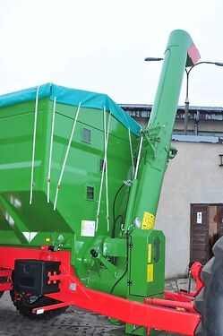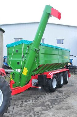 PRONAR Tridem-Überladewagen T 743, Tridem Technische Daten: Zul. Gesamtgewicht 33000 kg Eigengewicht 10300 kg Nutzlast 22700 kg Ladevolumen 34 m³ Pritsche innen LxB 7265 mm x 2492 mm Gesamtmaße LxBxH 10392/2900/3660 mm Bordwand 1440 mm + 340 mm Wandstärke (Boden/Bordwand/Aufsatz) 4/4/3 mm Spurweite 2260 mm Parabelfederung Deichselaugetragkraft 3000 kg Geschwindigkeit 40 km/h Durchmesser Entladeschnecke 430 mm Länge Entladeschnecke 5170 mm Entladeleistung ca. 200 - 400 m³/Std. Zapfwellendrehzahl 1000 U/min Austragehöhe 4565 - 4865 mm Bereifung 700/50 - 26,5 Serienmäßige Ausstattung: Automatische Überlastkupplung 1 3/4" Z=20 Doppelte Förderschnecke mit 2 Geschwindigkeiten Tridem-Fahrwerk mit Parabelfederung Achsabstand 1810 mm 1. + 3. Achse sind zwangsgelenkt Hydraulische Achssperrung bei Rückwärtsfahrt Trommelbremsen 406 x 140 mm Stahlbordwände mit vertikalen Verstärkungen Vorderwand mit 3 Sichtfenster Planengestell Überladeschnecke mit hydraulischer Bedienung Untenanhängung Aufstiegsleiter mit Podest an der Rückseite Starre Deichsel mit Kugelkopf K80 Teleskopschrägstützfuß mit Getriebe 2-Leiter-Druckluftbremse Keile mit Halter Kurbelbremse LED-Beleuchtungsanlage Metallkotflügel über alle Achsen Rahmen rot RAL 3000 Aufbau grün RAL 6010 Gegen Mehrpreis auf Anfrage: ALB-Regler 8-Punkt-Wiegeeinrichtung Drucker Rollplane Bereifung 600/55-26,5 Bereifung 600/55R26,5 Bereifung 700/50-26,5 Bereifung 710/50R26,5 TÜV-Gutachten Finanzierung und Anlieferung gegen Mehrpreis möglich